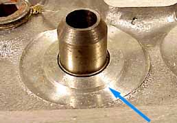 There are two types of 1600 cylinder heads, as far as valve seals go. All SAE aluminum heads are the early type on the left. The metric heads without air injection ports can be either type. The metric heads with air injection ports all use the late style valve seal area shown on the right. NOTE: The guides look different but are just different production batches, any head could have either type, and this has no bearing on the seal situation. IRON HEAD NOTE: Although the iron 1600 heads I've seen have guides in them, supposedly some real early 1600 iron heads were reworked 1500 heads. The 1500 iron head "looks" like it has guides but if you look closely you can see the upward projection that holds the valve is all one piece, and not separate with a wire retainer as shown below. And if it does NOT have separate valve guides (which measure .563 in diameter) you'll have to measure the upward projection that the valve goes into. If it measures .580 (like the 1500) you'll have to turn down these projections to about .563 to get the #132-32 valve seal to fit over it. The valve seals have to be pushed on with a little force, but you should be able to do it with your hands or a GENTLE tap. |